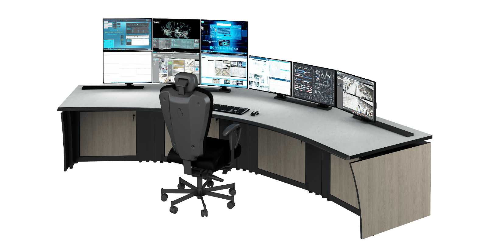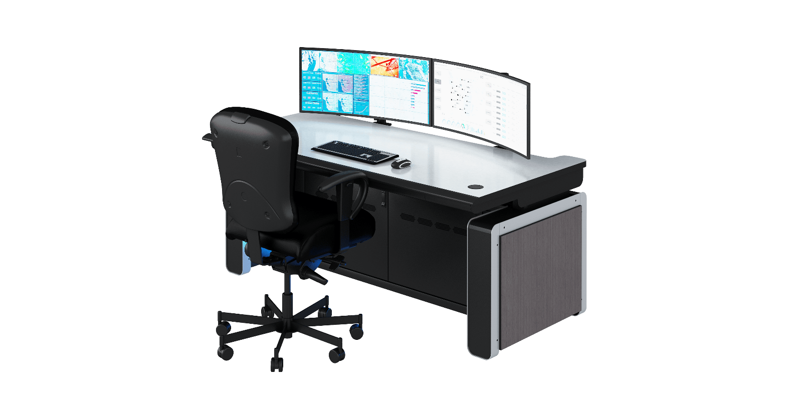The Vue Workstation transforms control room operations with configurable, connectable, adjustable design that adapts to any environment. Built for 24/7 continuous use Vue delivers complete operator comfort through horizontal/vertical monitor adjustability, Versa-Trak mounting systems, and static or sit/stand configurations. From open architectural designs to closed base options with premium surface materials, Vue workstations scale from single-operator setups to multi-operator command centers where focus and mission success are non-negotiable.