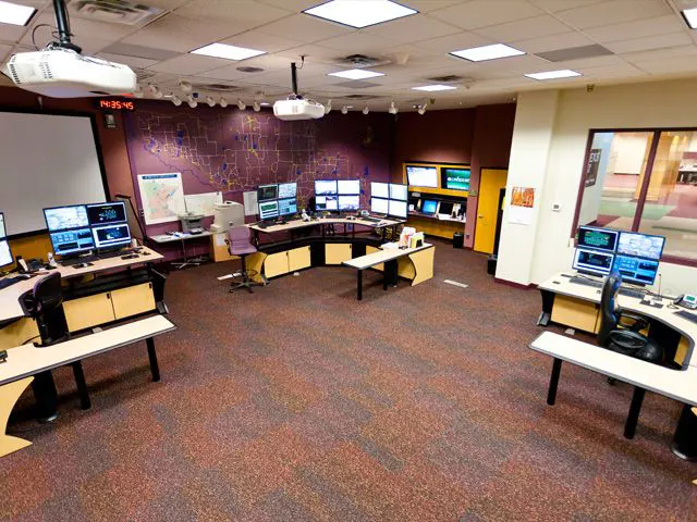 Some of the different operations that are performed and monitored at the workstations include: dispatching, trouble information, outage information, communication with line crews, answering customer calls, responding to alarms from various systems and monitoring both security and control systems. There are three console workstations in the new control center. At any given time one to three of them are manned. Each console is an identical copy of the next, which was a request from the system operators.